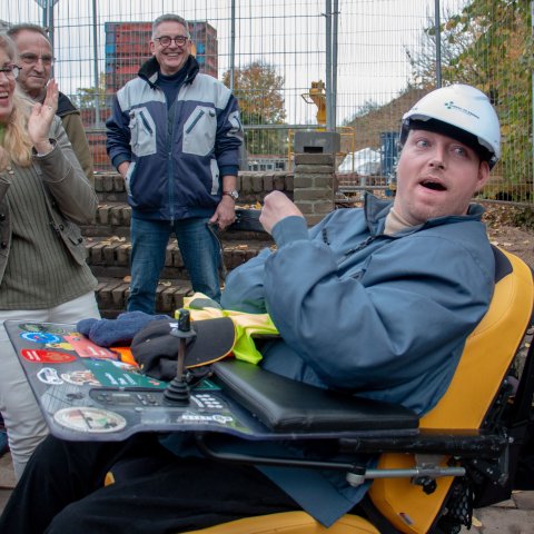 Een symbolisch moment volgde toen het bouwdoek werd onthuld en een toekomstige bewoner de bouwhelm opzette als ‘opzichter’ van dit mooie project.